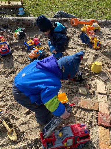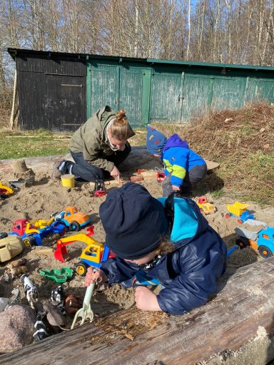 Wir sind mit den Kindern möglichst täglich draußen auf unserem naturnah gestalteten Außenspielplatz, auf dem Hofgelände um die Tiere zu besuchen, im Wald oder auch mal am Strand.