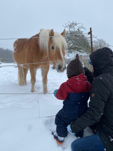 Auf dem Hof oder im Wald gibt es immer viel zu entdecken und so haben wir schon mit vielen Tieren Bekanntschaft geschlossen. Mal sind es die Hühner, die ein paar Körner haben möchten, mal eine dicke Hummel, die uns in der Sandkiste besucht oder die kleine Spinne, die im Spielhäuschen ein wunderschönes Netz gesponnen hat. Zu entdecken gibt es bei uns immer was.