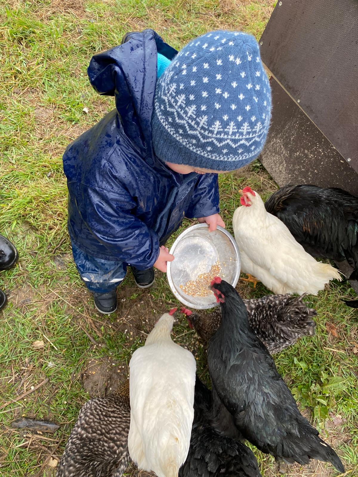 Auf dem Hof oder im Wald gibt es immer viel zu entdecken und so haben wir schon mit vielen Tieren Bekanntschaft geschlossen. Mal sind es die Hühner, die ein paar Körner haben möchten, mal eine dicke Hummel, die uns in der Sandkiste besucht oder die kleine Spinne, die im Spielhäuschen ein wunderschönes Netz gesponnen hat. Zu entdecken gibt es bei uns immer was.